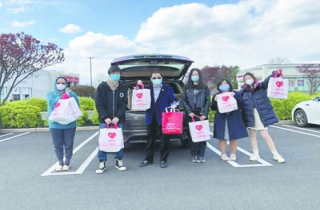 美国当地时间4月16日,美国大纽约地区福建学生学者联谊会主席刘伟(左三)为中国留美学生送上祖国寄来的“健康包”。受访者供图 |