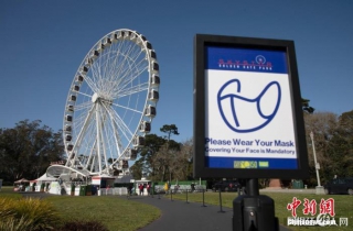 当地时间3月12日,美国加利福尼亚州旧金山金门公园的摩天轮排队处竖立着提醒人们佩戴口罩的标识。中新社记者 刘关关 摄