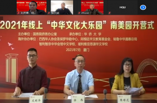 2021年线上“中华文化大乐园”南美园由中国国务院侨务办公室主办,华侨大学承办,巴西华人协会圣保罗华助中心、阿根廷华文教育基金会、秘鲁中华通惠总局、智利智京中华会馆中文学校、玻利维亚思源华文学校等单位共同协办。中国驻阿根廷大使馆侨务领事黄建国、中国驻巴西圣保罗总领馆侨务领事张于成、中新社巴西分社社长莫成雄,华侨大学华文教育处处长涂伟、国际交流合作处处长曾珊妮以及各协办单位负责人、华校代表以及全体任课教师、学员共近500人出席本次开营仪式。仪式由华侨大学华文教育处科长陈婷花主持。