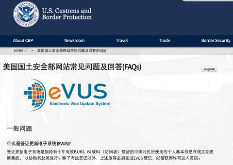 3月15日,美国海关和边境保护局(CBP)公布,即将设立签证更新电子系统(EVUS),今年11月起,持有10年期B1/B2、B1和B2签证的中国公民在赴美前需要这个系统上在线填写表格完成个人信息更新。