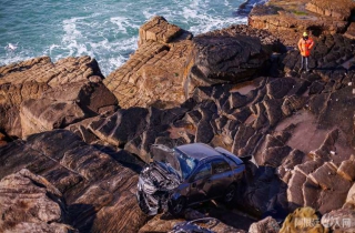 最后,损毁车辆被吊车从岩石上拖走。