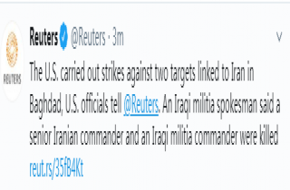 路透社刚刚消息称,美国官员证实,美国对巴格达两处与伊朗有关的目标发动了袭击。