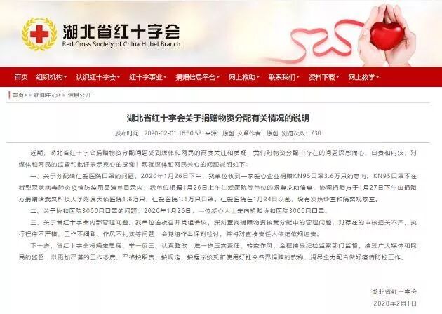 1日,针对近期媒体和网民的高度关注和质疑,湖北省红十字会就捐赠物资分配有关情况做出说明,并对物资分配中存在的问题深感痛心、自责和内疚,并将对直接责任人依纪依规追责。