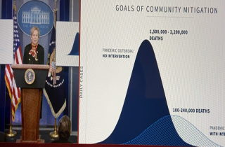 白宫应对疫情小组成员比克斯 (Deborah Birx)在发布会现场展示了预测疫情的相关模型。模型显示,在对疫情进行管理干预的情况下,美国新冠死亡病例也有可能达到10万至24万,如果不加控制,死亡病例可能达到150万至220万。在回答记者提问时,比克斯表示“没有什么神奇魔法,也没有灵丹妙药”,只有人们的行为才能改变疫情的走向。