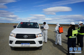 4月30日,在阿根廷卡拉法特,一名工作人员给进入项目现场的车辆消毒。新华社发(中国能建葛洲坝集团阿根廷孔拉水电站项目部供图)