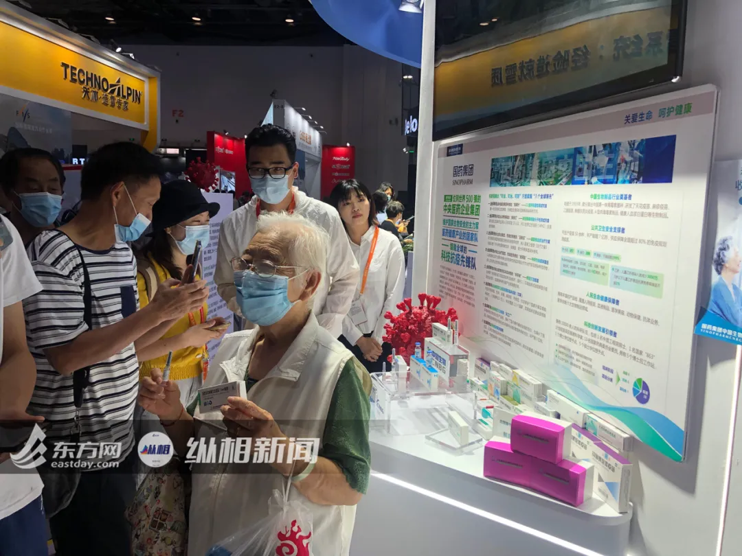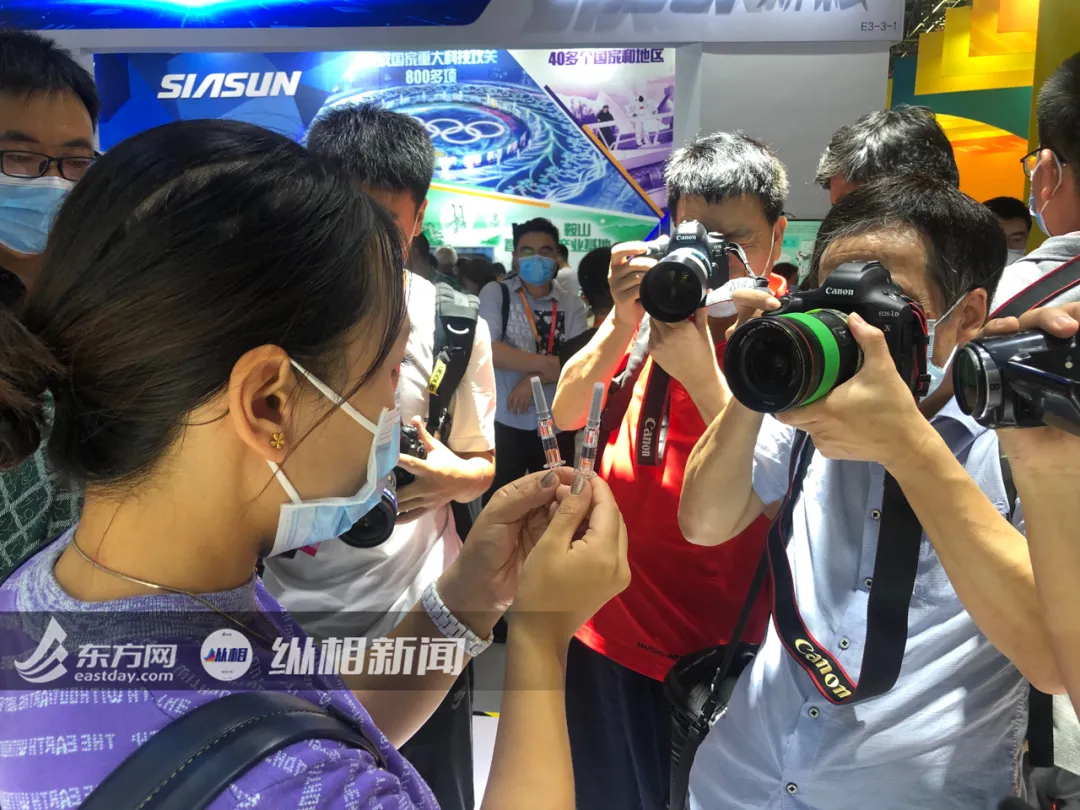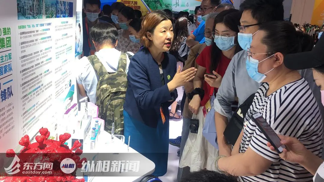 记者在国药集团展台看到,虽然天气炎热,人们对新冠疫苗的好奇和热情不减,前来咨询的市民络绎不绝,很多人拿起疫苗与之合照,仿佛成了一个网红“打卡”地点。