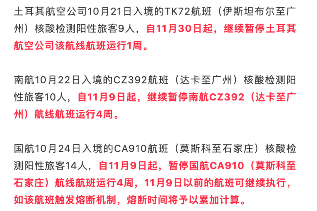 特别关注!民航局再对3个入境航班发熔断指令 中国侨网 • 2020-10-31 12:35• 收藏本文 10月30日,民航局再发熔断指令,对土耳其航空公司TK72航班、南航 CZ392、国航CA910航班实施熔断措施。根据民航局通报:上述航空公司熔断的航班量均不得用于其他航线。 转载本网稿件,原则上需要书面授权,不得篡改稿件主题。本网随时有权要求第三方停止侵权行为。 本网所载内容或图片,若涉及侵权,请联系删除。 31 ___________ 2020/10 特别关注!民航局再对3个入境航班发熔断指令 10月30日,民航局再发熔断指令,对土耳其航空公司TK72航班、南航 CZ392、国航CA910航班实施熔断措施。根据民航局通报:上述航空公司熔断的航班量均不得用于其他航线... [ 微信长按识别二维码或扫码查看分享内容 ]