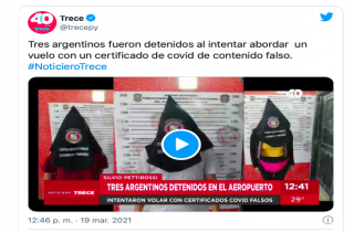 (阿根廷华人网3月20日讯 黄东)本周四上午,在巴拉圭西尔维奥·佩蒂罗西国际机场,3名阿根廷公民持假的新冠病毒检测报告准备登机时被捕。