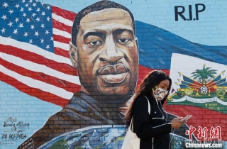 资料图:当地时间3月9日,美国纽约布鲁克林区一位市民走过弗洛伊德画像。 中新社记者 廖攀 摄