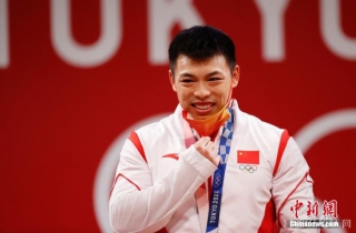 北京时间7月25日晚,在东京奥运会男子举重67公斤级比赛中,中国选手谌利军以抓举145公斤、挺举187公斤、总成绩332公斤夺冠,打破挺举和总成绩奥运纪录的同时,也为中国体育代表团摘得本届奥运会的第六金。图为谌利军在颁奖仪式上摘下口罩。 中新社记者 韩海丹 摄