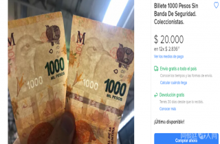 (阿根廷华人网9月28日讯 黄东)不久前1比索错版硬币的热潮尚未消退,日前又有收藏界人士发现了错版的阿根廷1000比索纸币,其网上售价达到2万比索。