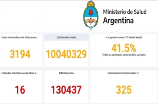 (阿根廷华人网2月6日讯 黄东)据阿根廷卫生部本周一通报,最近一周内全国新增新冠病例3194例,较前一周的4426例下降了27.8%;新增死亡病例16例,较前一周下降了40.7%。