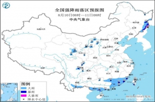 预计,8月10日08时至11日08时,黑龙江东部、吉林东部、青海东部、甘肃东部、宁夏、陕西北部、内蒙古河套地区、四川盆地西部和南部、湖南南部、江西南部、福建东部和南部、广东、广西南部、云南东南部、台湾岛中南部等地的部分地区有大到暴雨,其中,吉林东北部等地局部地区有大暴雨(100~120毫米)(见图1)。上述部分地区伴有短时强降水(最大小时降雨量20~50毫米,局地可超过60毫米),局地有雷暴大风等强对流天气。中央气象台8月10日06时发布暴雨蓝色预警。