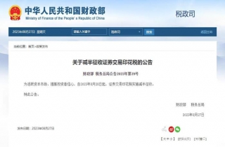 中新网8月27日电 据财政部网站消息,27日,财政部、税务总局发布《关于减半征收证券交易印花税的公告》。