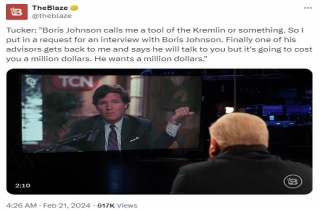 中新网2月21日电 综合外媒消息,近日,美国记者卡尔森在接受美国新闻网站“TheBlaze”的采访时透露,他此前曾试图采访英国前首相约翰逊,但约翰逊要卡尔森支付100万美元才同意接受采访。