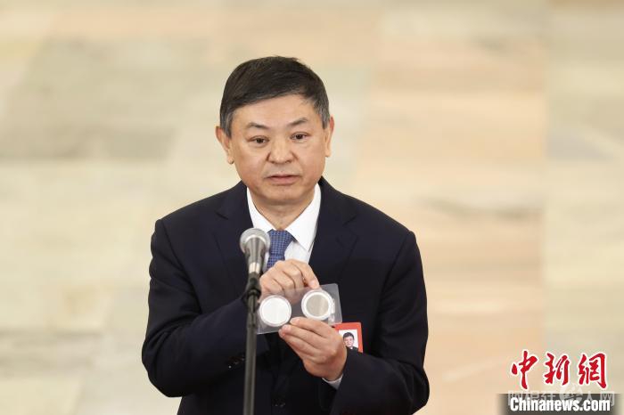 3月8日,十四届全国人大三次会议第二场“部长通道”集中采访活动在北京人民大会堂举行,生态环境部部长黄润秋接受采访。图为黄润秋展示两块滤膜来证明北京天气的变化。 中新社记者 韩海丹 摄