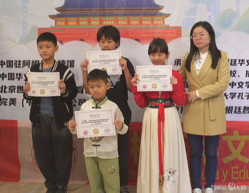 阿根廷华文教育基金会常务副会长、阿根廷拉普拉塔孔子学院中方院长龙敏利女士分别和优秀奖获得者王恒毅、郑涵硕、何诺祎、陈志杰、江欣语、王诗琪和郑语乔颁发获奖证书。
