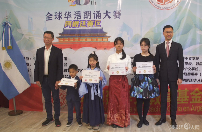 中国驻阿根廷大使馆领侨处王晋翼主任和阿根廷华文教育基金会名誉会长、阿根廷中国和平统一促进会何文强会长分别为获得金奖的选手陈宇宸、刘歌莉、许露西和薛梓宁颁发证书。