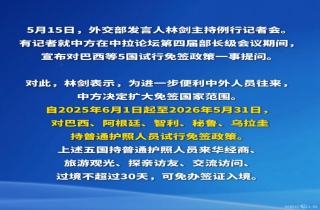 林剑:为进一步便利中外人员往来,中方决定扩大免签国家范围,自2025年6月1日起至2026年5月31日,对巴西、阿根廷、智利、秘鲁、乌拉圭持普通护照人员试行免签政策。上述5国持普通护照人员来华经商、旅游观光、探亲访友、交流访问、过境不超过30天,可免办签证入境。
