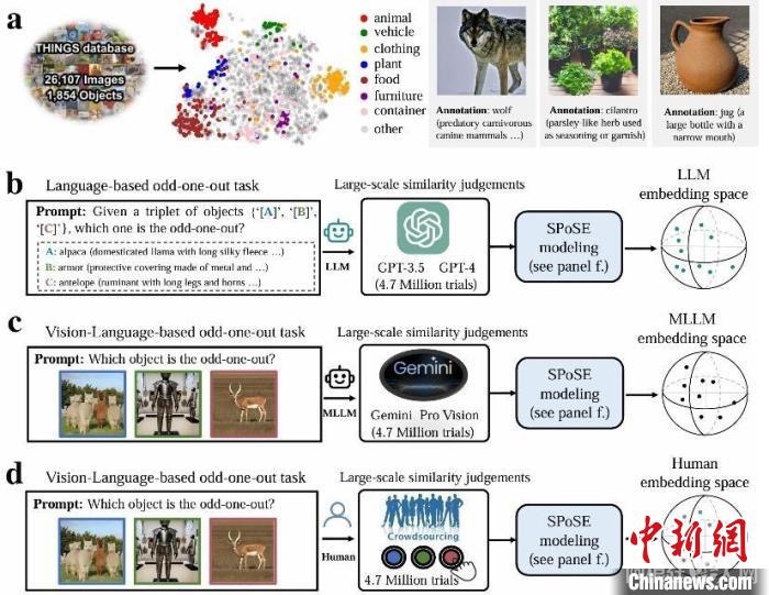 在本项研究中,研究团队从认知神经科学经典理论出发,设计出一套融合计算建模、行为实验与脑科学的创新范式。他们采用认知心理学经典的“三选一异类识别任务”,要求大模型与人类从物体概念三元组(来自1854种日常概念的任意组合)中选出最不相似的选项。通过分析470万次行为判断数据,研究团队首次构建了人工智能大模型的“概念地图”。