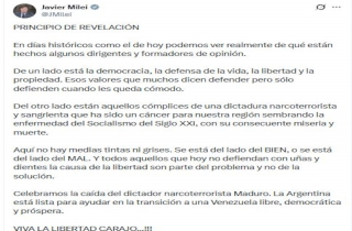 (阿根廷华人网1月3日讯 黄东)本周六,阿根廷总统米莱通过社交网络发文,庆祝美国在军事行动中“抓获”委内瑞拉总统马杜罗,同时表明态度:“要么站在正义的一边,要么站在邪恶的一边。”