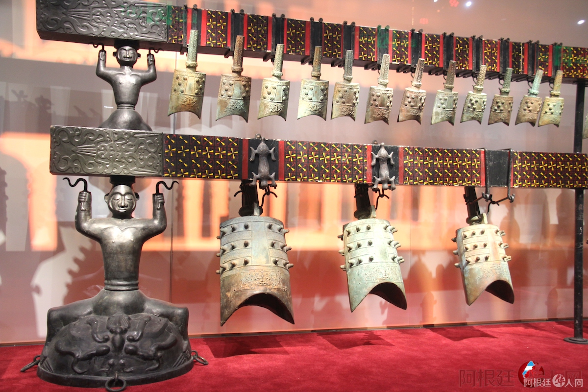 步入《钟鸣寰宇——曾国编钟与礼乐文明展》展厅,一套气势恢宏的曾侯乙编钟复制件瞬间吸引了所有目光。原件1978年出土于随州擂鼓墩,共65件,音域跨五个半八度,十二个半音齐备,至今仍可演奏,被中外专家誉为“世界第八大奇迹”。钟体上3755字错金铭文,是迄今所见最早体现音乐数理关系的出土文献。