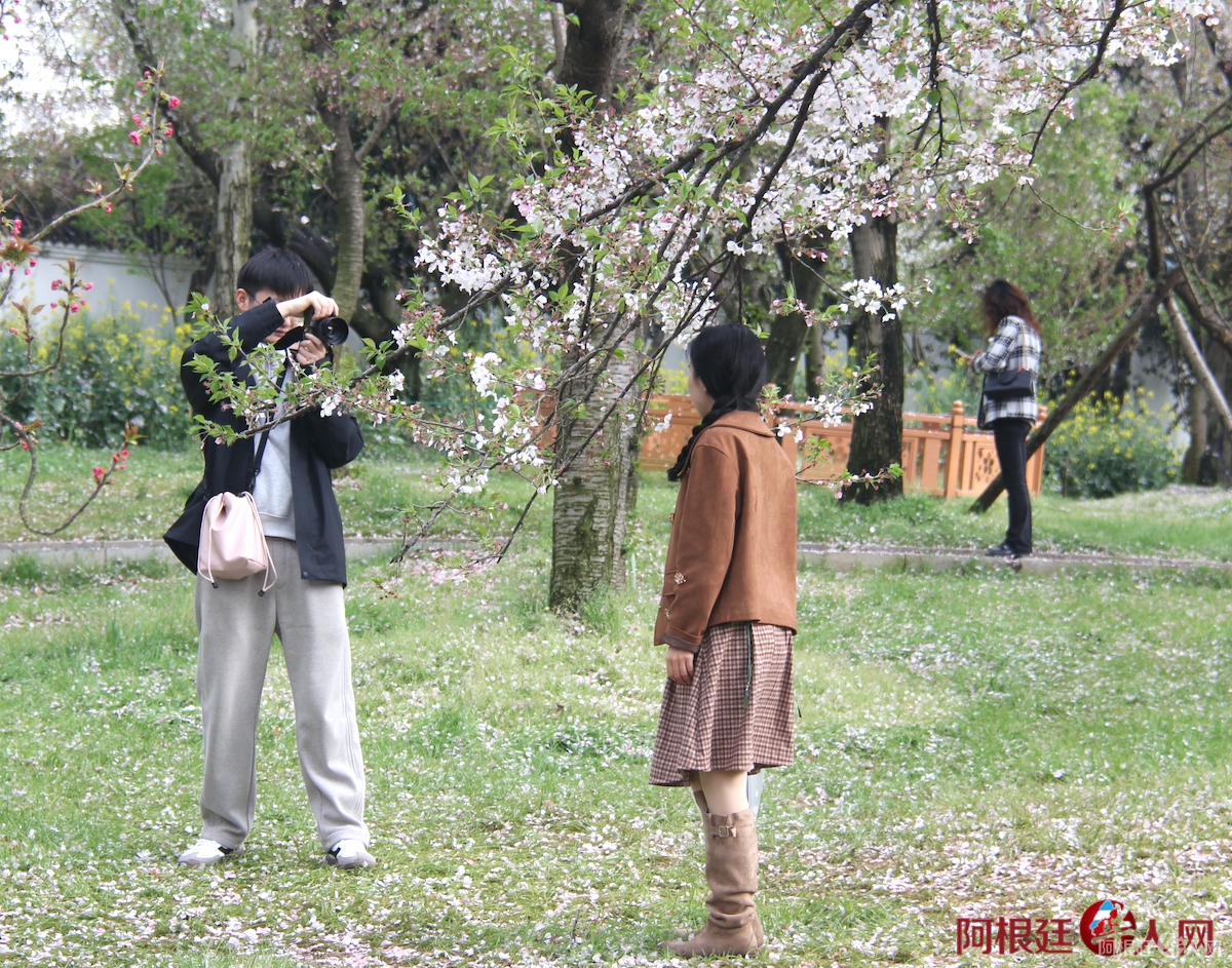 粉色的樱花云遮住了半边天,唐式建筑和漫天花瓣交织,美得让人陶醉。头顶是飘动的花海,脚下是涌动的人潮。