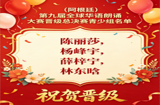 在此,热烈祝贺所有成功晋级总决赛的选手!希望各位选手再接再厉,潜心打磨朗诵作品,在全球总决赛的舞台上从容展现自身的华语风采与青春活力,以声传情、以语载道,尽情绽放属于自己的光芒,展现阿根廷华裔青少年的优秀风貌。