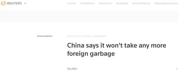 中国于周二正式通知世界贸易组织(WTO),表示今年底开始将不再接收外来垃圾,包括废弃塑胶、纸类、废弃炉渣、与纺织品。而禁令将会于2017年年底生效。