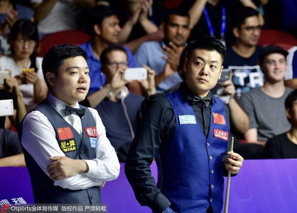 第五局,丁俊晖对阵特鲁姆普。丁俊晖开球漏出远台机会,特鲁姆普精准打进,梁文博上手,11分后走位不理想白球紧贴蓝球做出斯诺克。特鲁姆普一杆大力解球留下机会,丁俊晖进攻红球出现失误。霍金斯上手,12分后黑球出现失误,梁文博上手12分后同样转入防守。最后阶段的防守战中,丁俊晖高质量的斯诺克迫使霍金斯第三次才解到蓝球,最终梁文博打进蓝球和粉球拿下本局。中国A队3-3战平英格兰,进入决胜局。Gxc阿根廷华人网