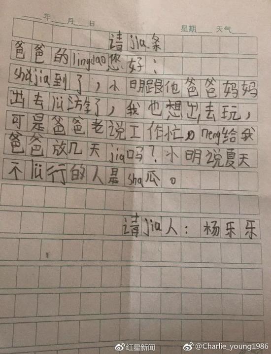 8岁娃写"最萌假条":爸爸老说工作忙 能给他放假吗 国内新闻 • 2017-07-25 08:26• 收藏本文 转载本网稿件,原则上需要书面授权,不得篡改稿件主题。本网随时有权要求第三方停止侵权行为。 本网所载内容或图片,若涉及侵权,请联系删除。 25 ___________ 2017/07 8岁娃写"最萌假条":爸爸老说工作忙 能给他放假吗 8岁娃写"最萌假条":爸爸老说工作忙 能给他放假吗 [ 微信长按识别二维码或扫码查看分享内容 ]