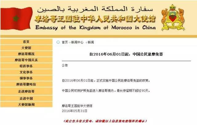 摩洛哥王国驻华大使馆31日正式发布公告,自2016年06月01日起,正式实施中国公民赴摩洛哥免签的政策。中国公民可持护照免签进入摩洛哥境内,最长停留期不超过90天。