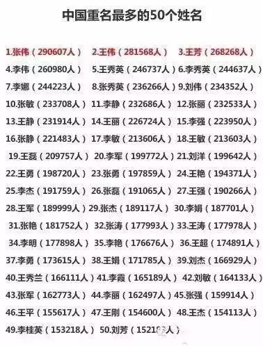 你的熟人里有他们吗?中国重名最多的50个姓名 国内新闻 • 2017-11-07 08:45• 收藏本文 f0a阿根廷华人网 转载本网稿件,原则上需要书面授权,不得篡改稿件主题。本网随时有权要求第三方停止侵权行为。 本网所载内容或图片,若涉及侵权,请联系删除。 07 ___________ 2017/11 你的熟人里有他们吗?中国重名最多的50个姓名 你的熟人里有他们吗?中国重名最多的50个姓名 [ 微信长按识别二维码或扫码查看分享内容 ]