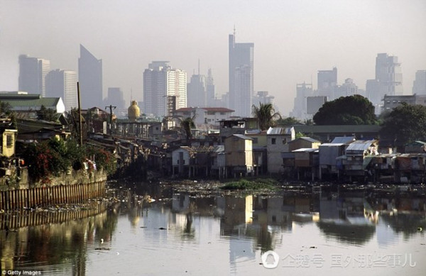菲律宾马尼拉,在阳光照射下闪闪发光的摩天大楼和简陋的棚屋以及肮脏的河水形成一个鲜明的对比。