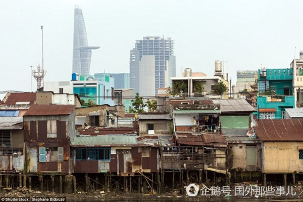在越南的胡志明市西贡河边,现代的高楼大厦在后面拔地而起,衬托了前面的贫民窟木质的房子。