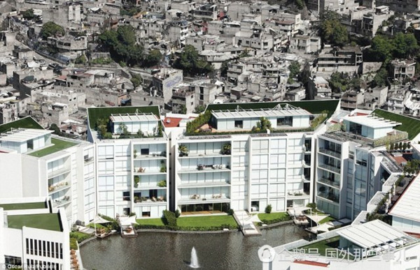 在墨西哥,这栋公寓的豪华程度在发达国家也不遑多让,远处则是摇摇欲坠的破旧房子。