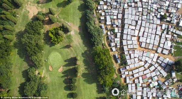 上图是在南非德班,左边是高尔夫球场,右边仅仅几米远则是密密麻麻的棚屋,它们之间只隔着一条低矮的栅栏。