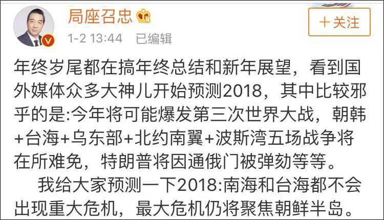 "局座"张召忠2018"预测":绝无可能爆发世界大战 国内新闻 • 2018-01-03 08:46• 收藏本文 3uY阿根廷华人网 转载本网稿件,原则上需要书面授权,不得篡改稿件主题。本网随时有权要求第三方停止侵权行为。 本网所载内容或图片,若涉及侵权,请联系删除。 03 ___________ 2018/01 "局座"张召忠2018"预测":绝无可能爆发世界大战 "局座"张召忠2018"预测":绝无可能爆发世界大战 [ 微信长按识别二维码或扫码查看分享内容 ]