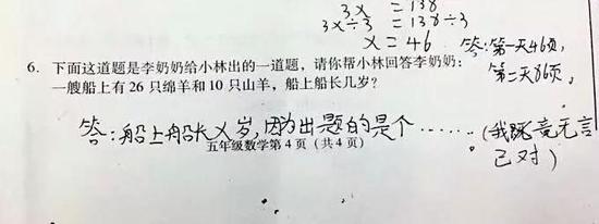 网传图片显示,学生们的回答五花八门,包括“船上船长大于18岁,因为未成年人无法开货船”、“船上船长36岁,因为船长很自恋,所以便把船上的羊的数量便为自己的年龄,而且,小林你以后要自己认真回答问题,不要问别人,好了,我编不下去了”。也有学生一本正经作答:“无法确定,绵羊与山羊的只数与船长的岁数没有关系,求不出来船长的年龄。”