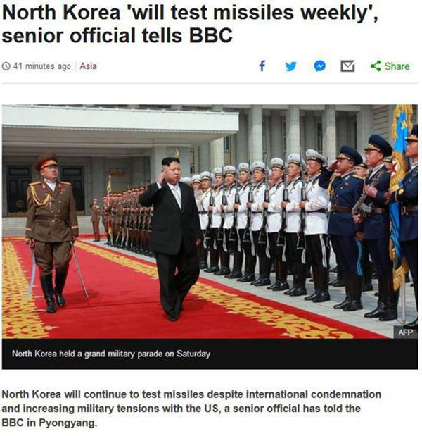 海外网4月18日电 据英国广播公司(BBC)报道,朝鲜外务省副外相韩成烈在平壤接受采访时表示,朝鲜将继续进行导弹试射活动,将会在每周、每月和每年进行更多导弹试射。他还表示,如果美国采取军事行动,“战争将一触即发”。