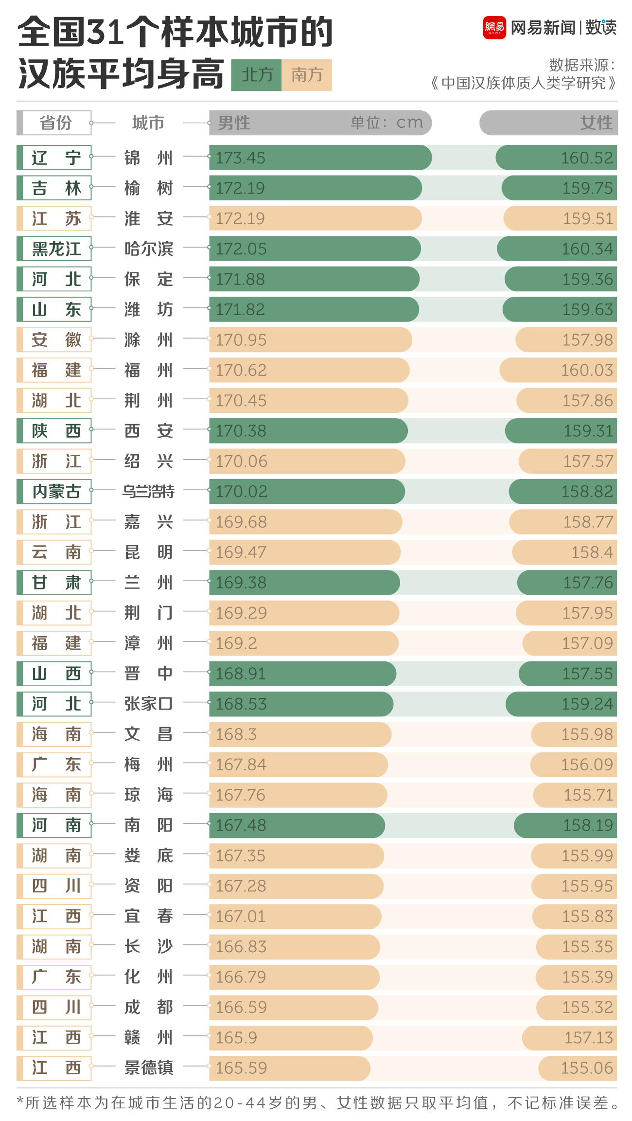 与之相比,南方多个城市的确稍逊一筹,湖南、四川、江西的样本城市均在尾列,江西景德镇以男性165.59cm、女性155.06cm的数值位居最后。