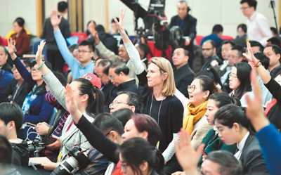 图为3月7日,十三届全国人大一次会议新闻中心举行记者会,邀请农业部部长韩长赋,农业部新闻发言人、办公厅主任潘显政就“实施乡村振兴战略推动农业转型升级”相关问题回答中外记...