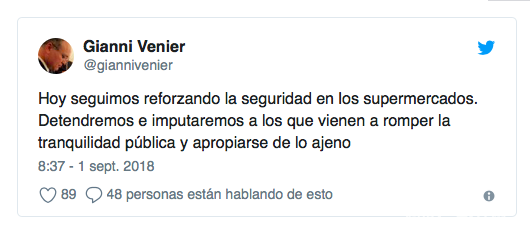 (阿根廷华人网9月1日讯/黄东)日前在门多萨地区发生了哄抢事件后,省安全部长Giani Venier通过推特发文,对企图参与哄抢的歹徒发出警告,声称对于打破公共安宁的行为必将予以严惩。