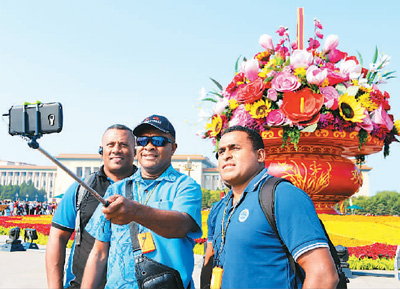 今年国庆,外国游客在北京天安门广场拍照留念。胡庆明摄 (人民图片)
