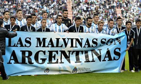 本周六,在与斯洛文尼亚的友谊赛赛前,阿根廷队球员打开一幅写有“马岛属于阿根廷”的横额,宣示阿根廷对马岛(英国称为福克兰群岛)的主权。