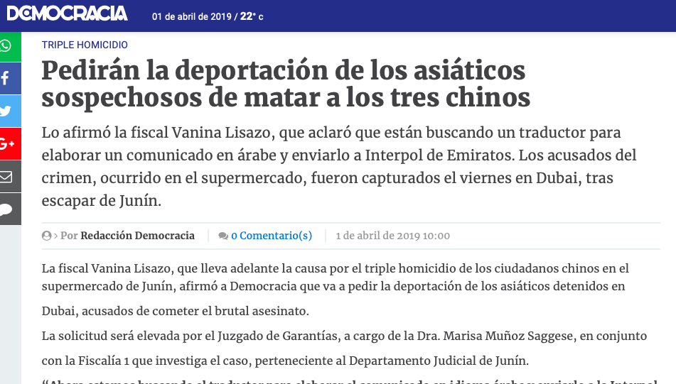 (阿根廷华人网4月2日讯 黄东)据阿根廷当地媒体报道称,负责案件的检察官Vanina Lisazo证实称,将对日前在迪拜被捕的犯罪嫌疑人申请驱逐令。