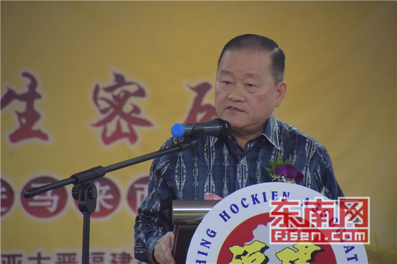 现场合影。图为世界福州十邑同乡总会执行会长、马来西亚福州社团联合总会总会长拿督斯里刘为强太平局绅(右),晋汉连省华总会长、古晋福建公会主席兼大会主席拿督黄良杰(左),以及福建省政协常委、福建佛学院院长、福州开元寺方丈本性禅师(中)。