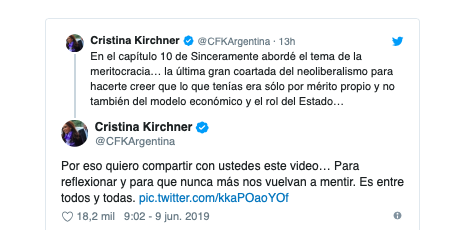 (阿根廷华人网6月9日讯 黄东)前总统克里斯蒂娜今天通过社交网络发布一段视频,在其中批评了现政府的管理模式,并通过通用汽车公司的现状将其执政同马克里政府相对比。