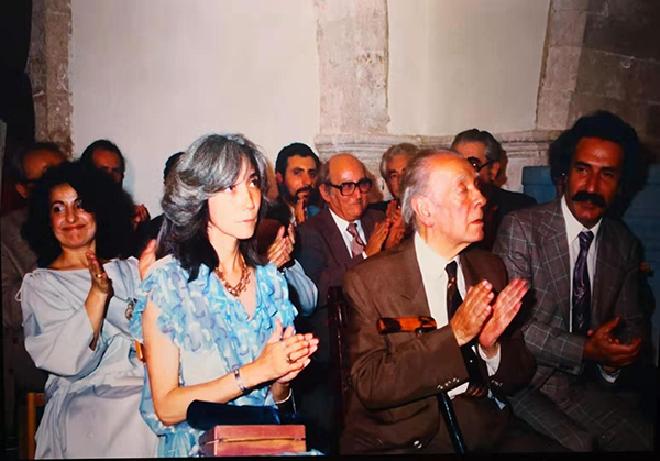 玛丽亚·儿玉是博尔赫斯最后一任妻子,她陪伴博尔赫斯走完人生最后的时光。在展览现场,她对观众回忆起自己16岁时与博尔赫斯初识的经历:“我喜欢文学,梦想成为一名文学讲师,但大家都觉得我太害羞了,无法在讲台上大声地说话——直到我见到博尔赫斯,他比我更害羞,说话的声音更轻柔,我想,既然他能做一个很好的文学讲师,那我也一定行。”