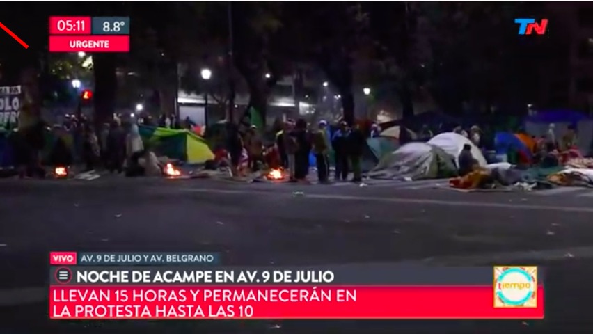 (阿根廷华人网9月5日讯 黄东)从昨天上午开始,社会组织和政治团体再次发起示威游行,要求政府实施紧急食品法案。游行活动在布市多个地点发起,从昨天下午开始,部分示威者在社会发展部门前搭起了帐篷,也有人示威者彻夜阻断七九大道,表达抗议。